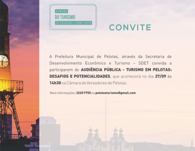 Na quarta-feira às 14h30, na Câmara de Vereadores, teremos uma audiência pública comemorativa ao Dia Mundial do Turismo, onde iremos apresentar à população as ações que estão sendo desenvolvidas pela Secretaria de Desenvolvimento Econômico e Turismo e Conselho Municipal de Turismo.
