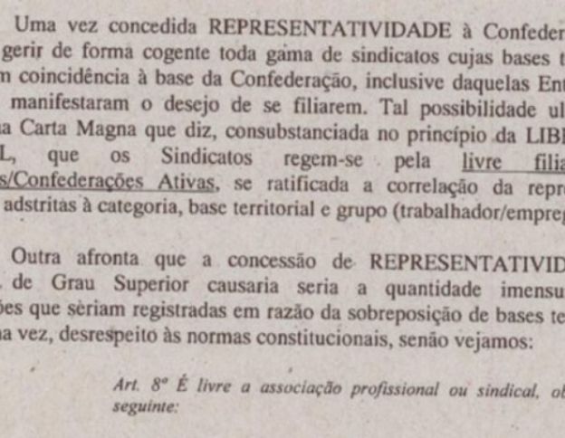 Para o MTE, “Tal possibilidade ultrajaria o disposto na Carta Magna que diz consubstanciada no princípio da liberdade sindical, que os sindicatos regem-se pela livre filiação às Federações/Confederações ativas (...)”.