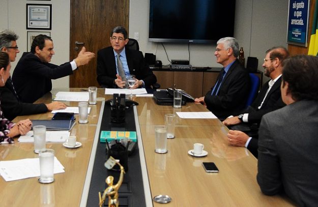 Os ministros do Turismo, Henrique Eduardo Alves, e da Fazenda, Joaquim Levy, e representantes do mercado definem alíquota a ser aplicada a remessas para o exterior